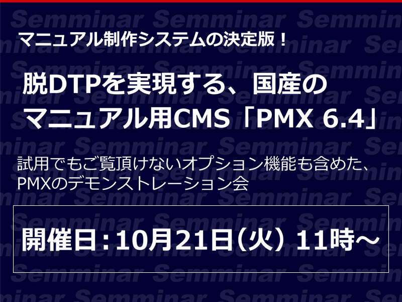 本セミナーは多数のご要望を頂いておりました、マニュアル用CMS「PMX」のデモンストレーション会となります。基本機能はもちろんのこと、試用プログラムではご利用頂けないオプション機能までご案内いたしますので、脱DTPを実現する、マニュアル用のCMSとはどのようなものかをご覧頂ける、またとない機会です。是非ご参加ください。