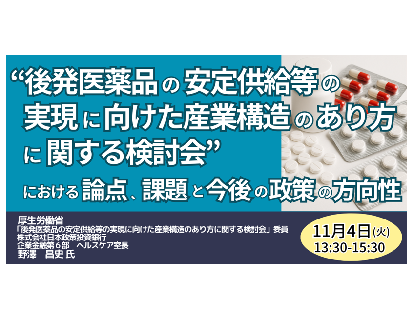 - 講師名厚生労働省「後発医薬品の安定供給等の実現に向けた産業構造のあり方に関する検討会」委員 野澤 昌史 氏