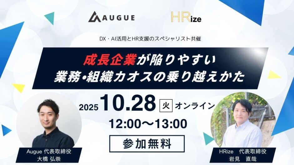 本セッションでは、業務整理×AI・DX導入(Augue)と人と組織の最適化(HRize)の両側面から、