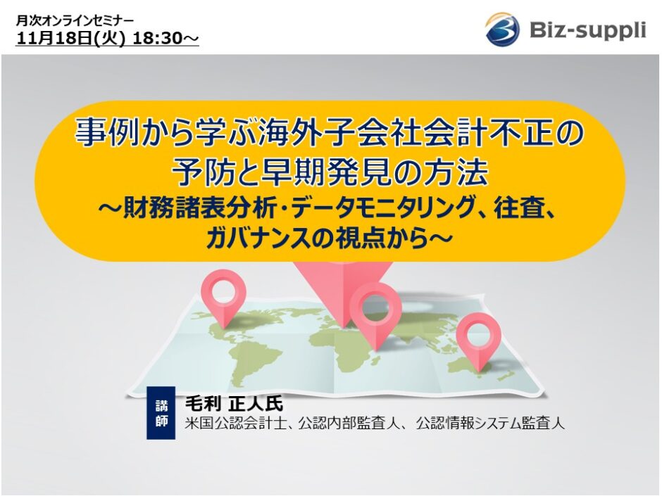 本セミナーでは、2010年代に発生した大型の日系海外子会社の「会計不正(粉飾)」 代表的10事例を類型化し、不正のスキーム、発生を許した要因、発覚の経緯、財務上の不正の兆候を明らかにします。その上で、事例を通して予防と早期発見に向けた具体的ポイントを解説します。