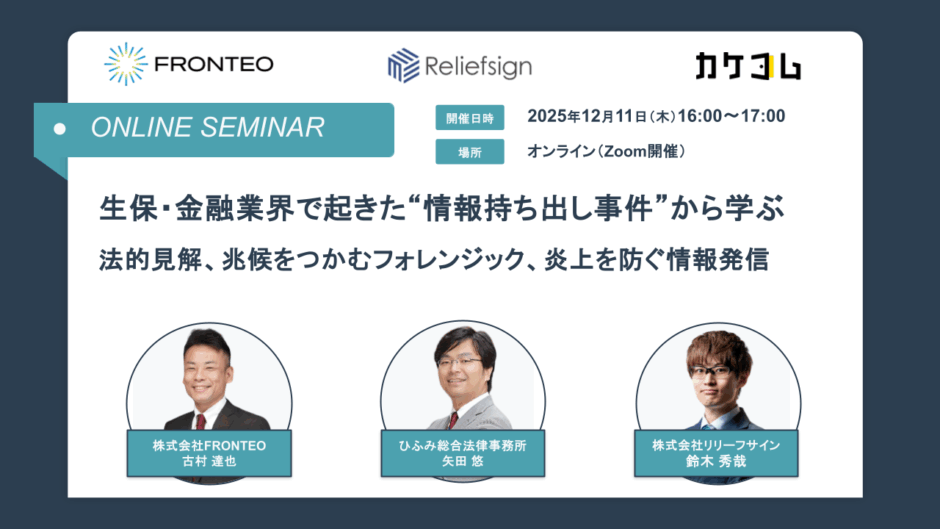 本セミナーでは、SNS・デジタルモニタリングを通じて風評・炎上リスクの早期対応を支援する株式会社リリーフサイン、フォレンジック技術による内部情報流出の兆候検知を行う株式会社FRONTEOの取り組みをもとに、金融業界における“内と外”のリスク再点検ポイントを解説します。