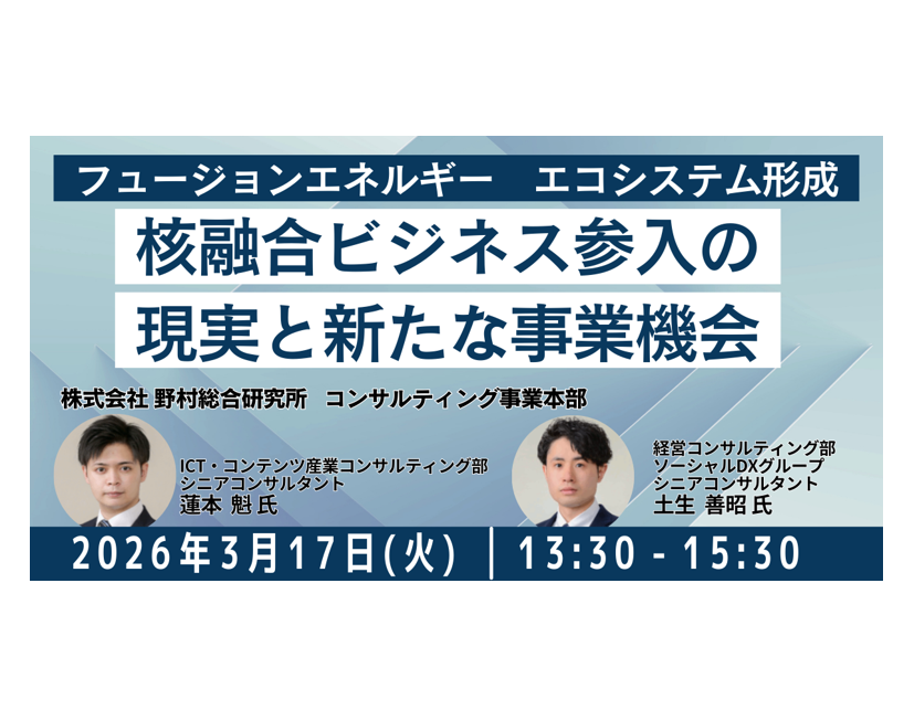 - 講師プロフィール【蓮本 魁 氏】 2020年3月 慶應義塾大学 経済学部 卒業 2020年4月~2021年8月 ピー・アンド・イー・ディレクションズ 入社 経営コンサルタントとして、主にPEファンド向けのビジネスデューデリジェンスや投資先企業向けの 再生計画策定といった案件に従事。 2021年9月~現在 野村総合研究所 入社 経営コンサルタントとして、通信や宇宙といった領域にて事業計画策定や新規事業開発、官公庁におけるスタートアップ支援・補助金運営支援に従事。 2023年4月~2024年3月まで、核融合スタートアップの立ち上げにプロボノとして参画。全社戦略担当として、アクセラレーションプログラムへの採択や、政府補助金への採択実現、事業パートナーとの契約締結や資金調達に貢献。 スタートアップでの経験を活かし、現在はシニアコンサルタントとして、宇宙や核融合といったディープテックの産業振興に尽力している。 【土生 善昭 氏】 2020年3月 大阪大学大学院 工学研究科電気電子情報工学専攻 修了 核融合炉のダイバーターにおける水素吸蔵に関する研究に従事 2020年4月~現在 野村総合研究所 入社 経営コンサルタントとして主に新規事業開発、オープンイノベーション・スタートアップ支援領域において、官民問わず多数のプロジェクトに従事。 スタートアップを核とした核融合産業に関する知見を有する。