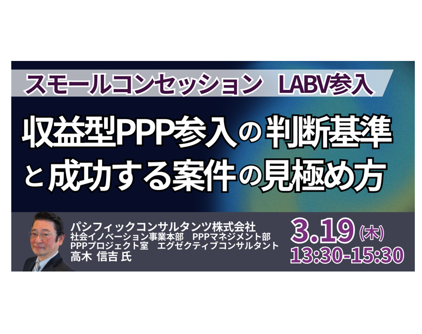 - 講師名パシフィックコンサルタンツ株式会社 社会イノベーション事業本部 PPPマネジメント部 PPPプロジェクト室 エグゼクティブコンサルタント 高木 信吉 氏