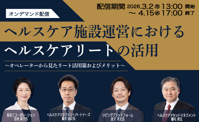 人口減少に加え、金利上昇による借入コスト上昇、インフレによる工事費高騰に人件費高騰も加わり、介護施設運営は厳しい局面を迎えています。次期報酬改定も見据え、超高齢時代のヘルスケア施設事業のあり方を考えると共に、ヘルスケアリートの活用が今後の事業運営にもたらす可能性・メリット・デメリットをテーマに、オペレーターやリート運用会社をお迎えし、パネルディスカッションを行い課題解決に取組みます。